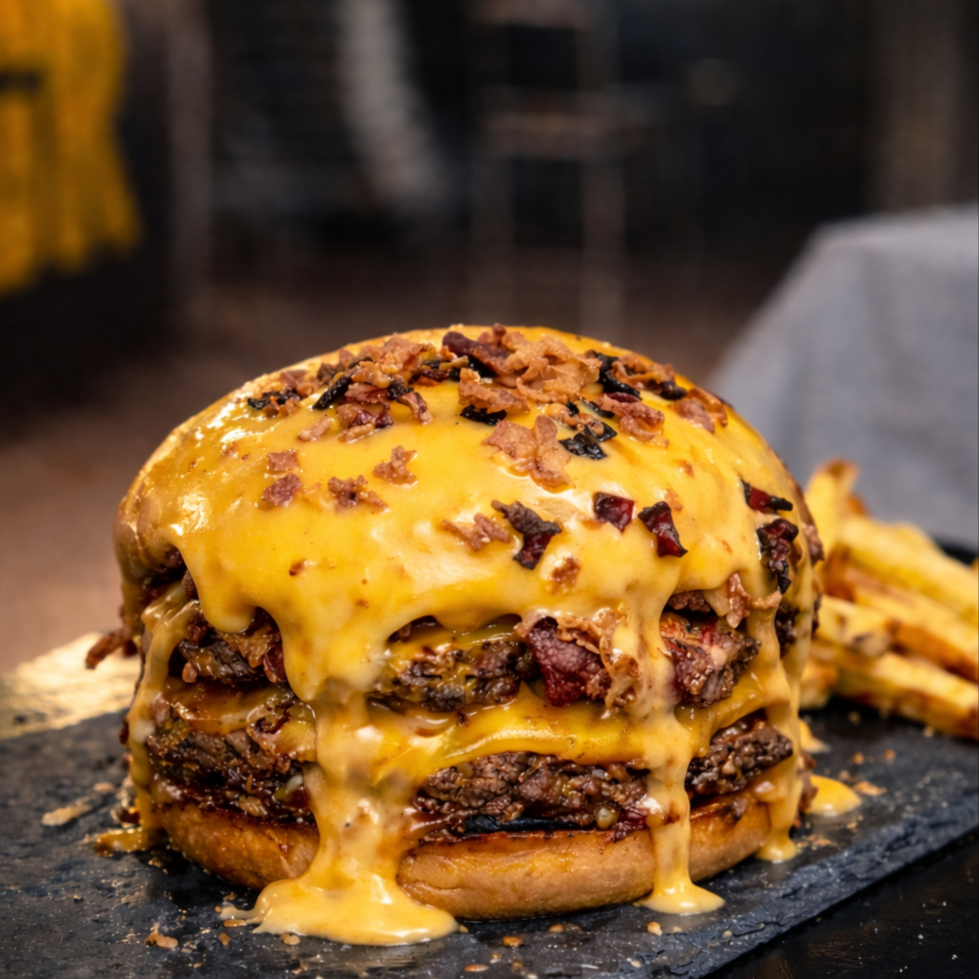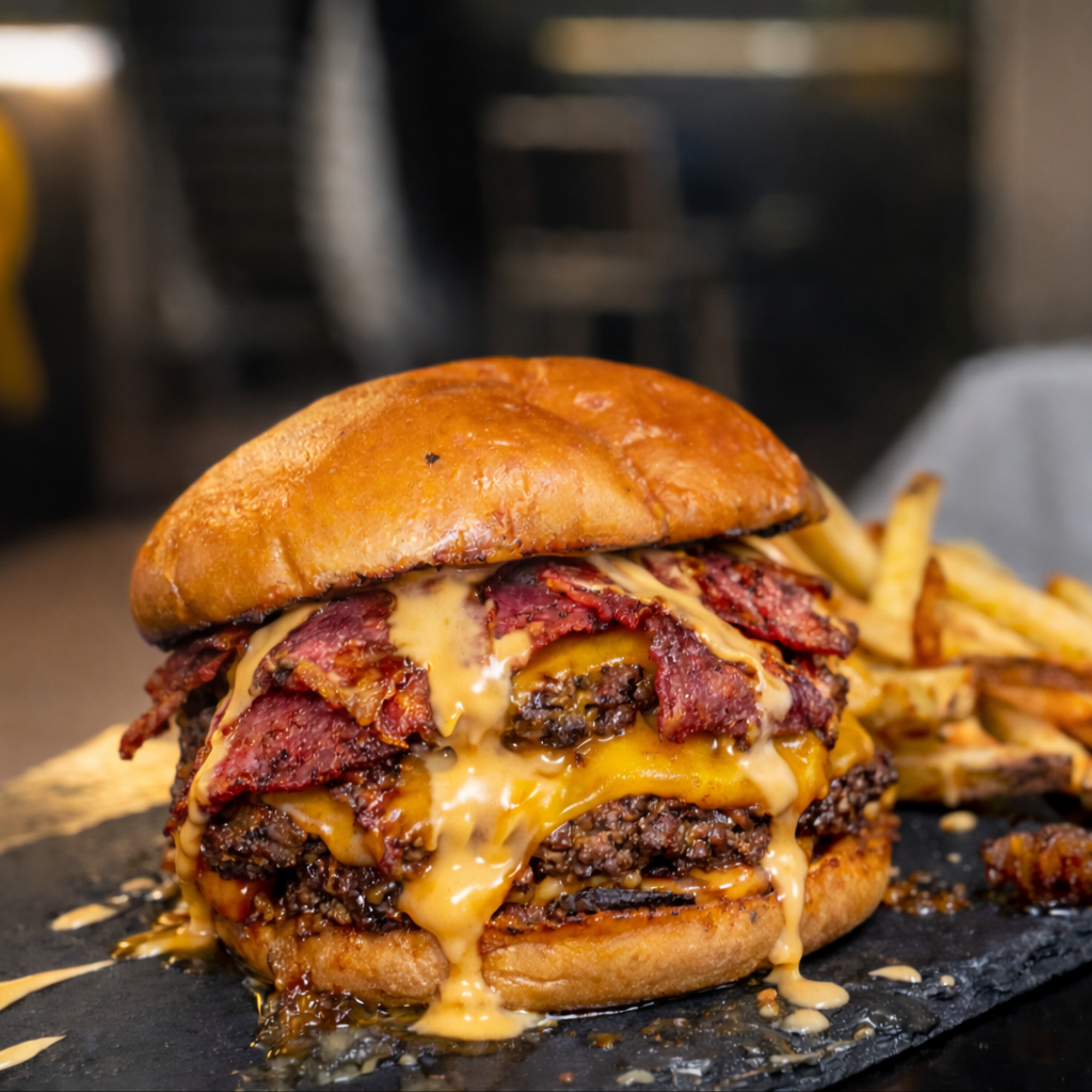 Pan brioche · Smash de ternera · Cheddar · Bacon de pavo · Cebolla crujiente · Salsa BBQ