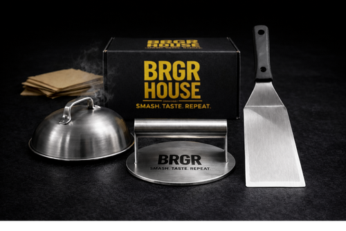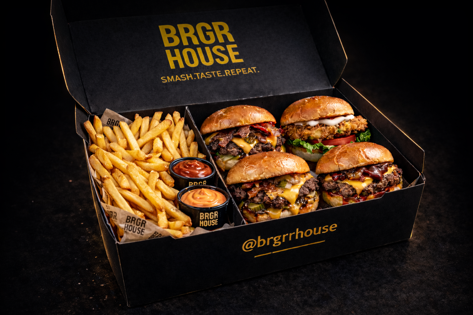 Pan brioche · Smash de ternera · Cheddar · Pepinillos · Cebolla frita · Salsa BRGR