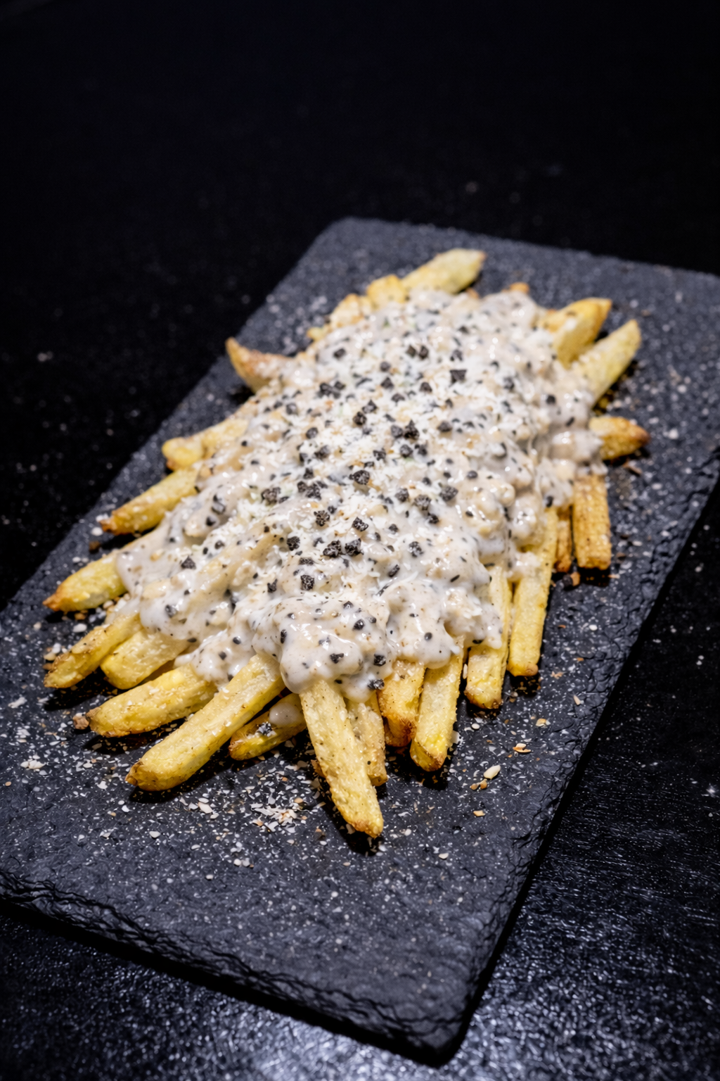 Pan brioche · Smash de ternera · Queso de cabra · Cebolla caramelizada · Salsa trufa champiñón · Salsa miel-mostaza
